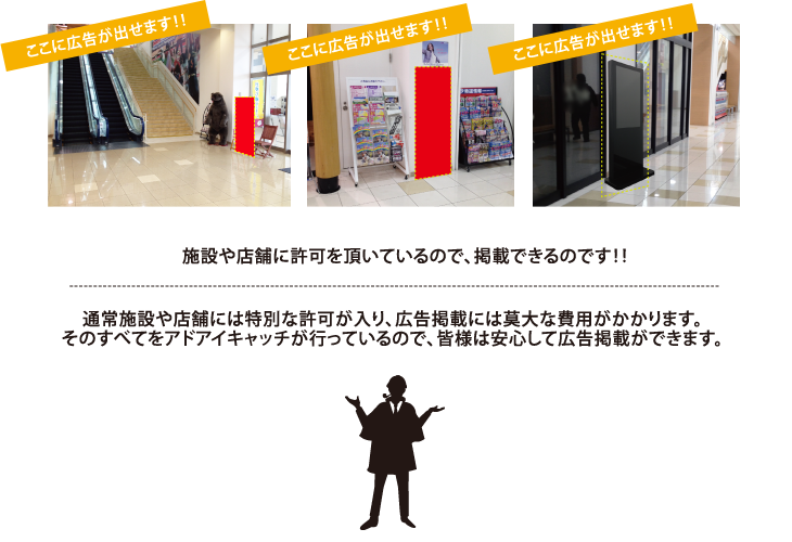 全国に1,000ヶ所以上設置している液晶看板アイキャッチ及び無料設置しているアイキャッチを使用し、一般のユーザーへ広告宣伝を行う方法です。このアドアイキャッチは従来のデジタルサイネージ広告とは違い、多数の掲載場所が確保さえているという事!